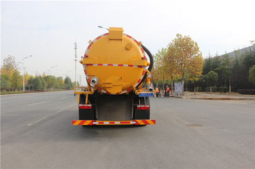 該車用于吸除水坑、下水道里污濁物;主要裝置有罐體及吸污裝置;隨底盤選裝駕駛室,選裝罐體兩側附件樣式及后部樣式;罐體總容量:11.16立方米,罐體有效容積:10.63立方米;罐體外形尺寸(含封頭總長×直徑)(mm):5400×1800,4800×1800;ABS系統生產廠家,型號 :焦作博瑞克控制技術有限公司,J ABS;襄陽東風隆誠機械有限責任公司,ABS/ASR-24V-4S/4M.側、后防護材料均為:Q235碳鋼,連接方式均為:螺栓連接,后部防護截面尺寸(mm):120×50,后部防護離地高度(mm):450.卸料方式:舉升后卸式。采用4500mm,3950mm軸距。隨底盤選裝燃油箱,電瓶,尿素罐,儲氣筒左右安裝位置。選裝限速裝置,限速89.